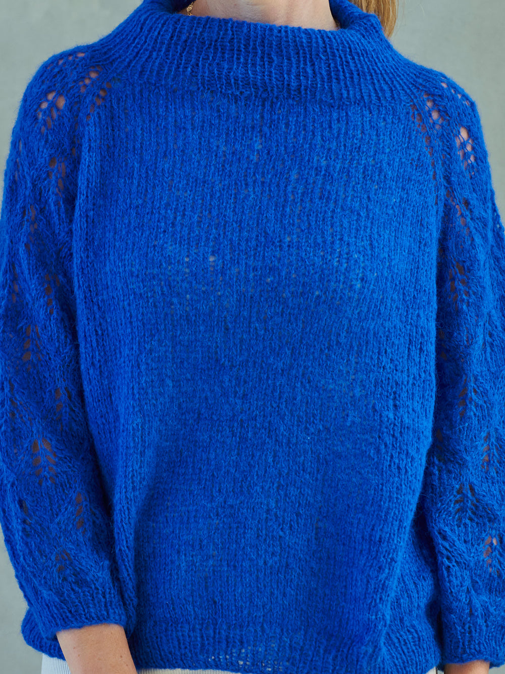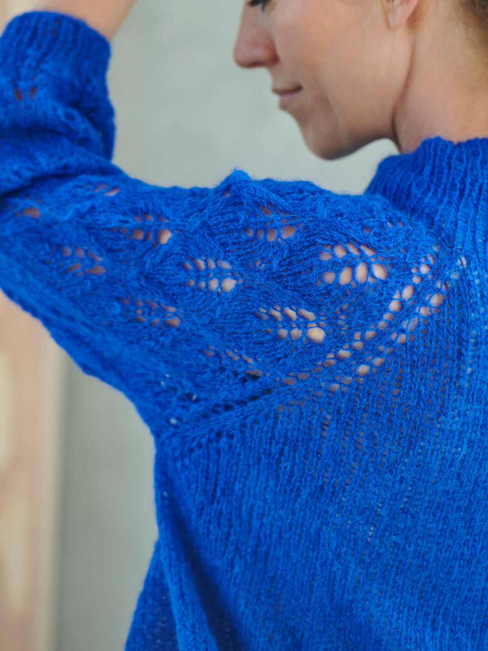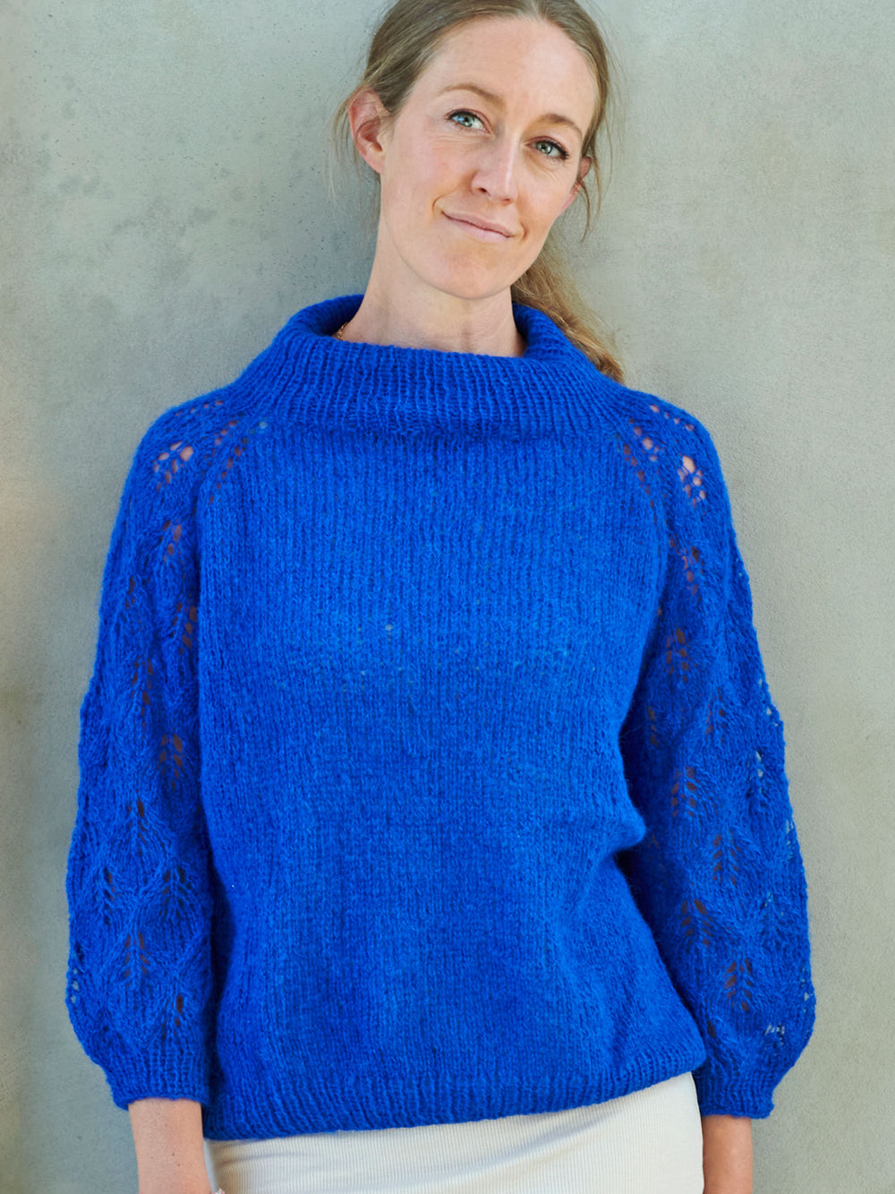 Die Rønbjerg Bluse ist eine wunderbar leichte und luftige Bluse mit gemusterten 3/4-Ärmeln und einem schönen Kragen. Die Bluse wird von oben nach unten gestrickt, sodass du mit dem breiten Kragen beginnst. Vorder- und Rückenteil der Bluse werden in glatt rechts gestrickt, während die Ärmel in einem eleganten Blattmuster gearbeitet werden. Der große Kragen fällt wunderschön und bildet ganz von selbst den Halsausschnitt.