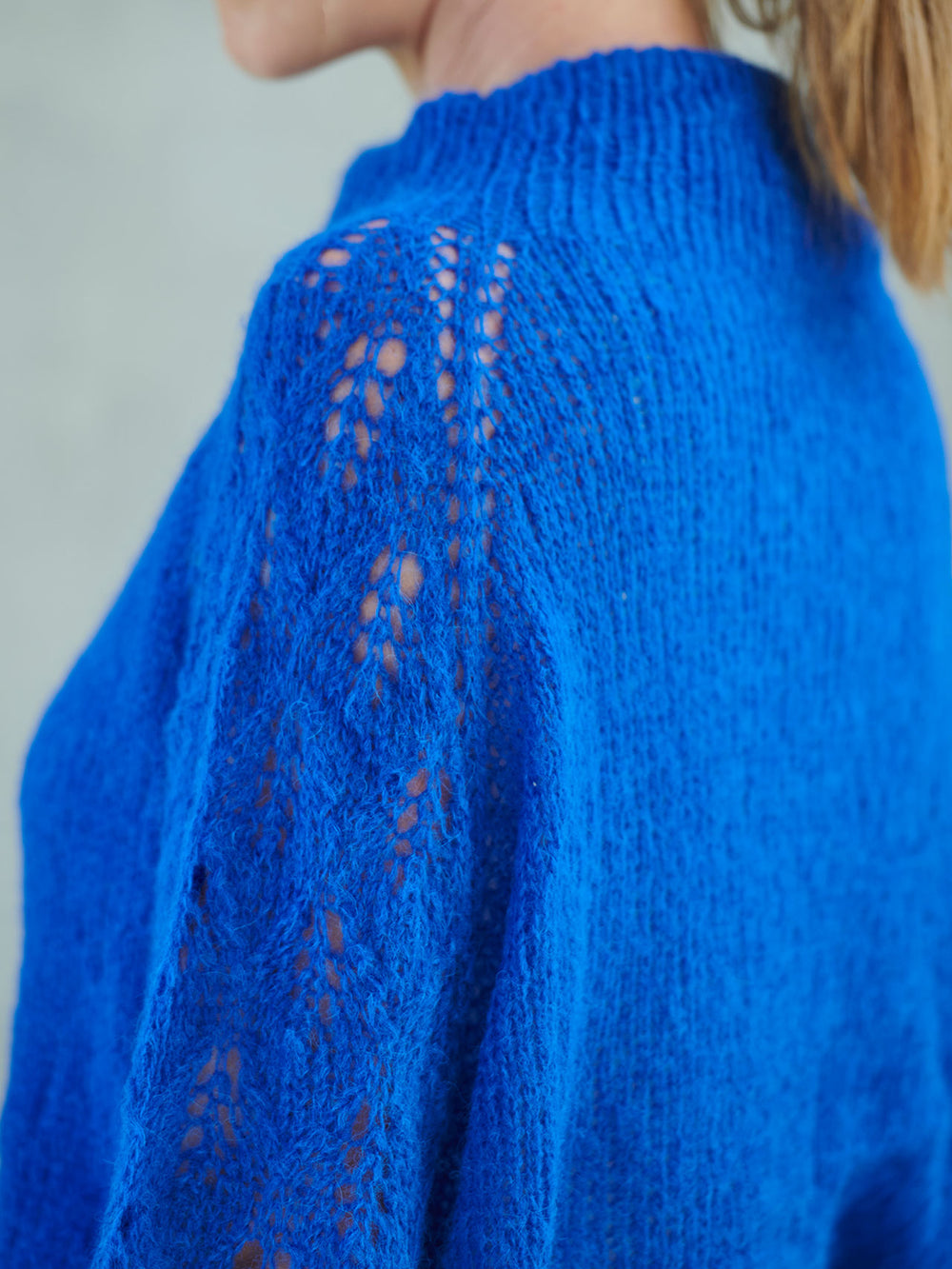 Die Rønbjerg Bluse ist kurz und hat einen Bewegungsspielraum von etwa 30 cm. Es ist jedoch ganz einfach, die Länge sowohl des Körpers als auch der Ärmel während des Strickens zu verlängern, da die Bluse von oben nach unten gestrickt wird. Sie hat eine superleichte und luftige Struktur, da sie mit zwei Fäden des Garns Mayflower Elba gestrickt wird. Das feine Garn ist weich und angenehm, und mit zwei Fäden bekommt die Bluse zusätzlichen Flaum, ohne zu schwer zu werden.