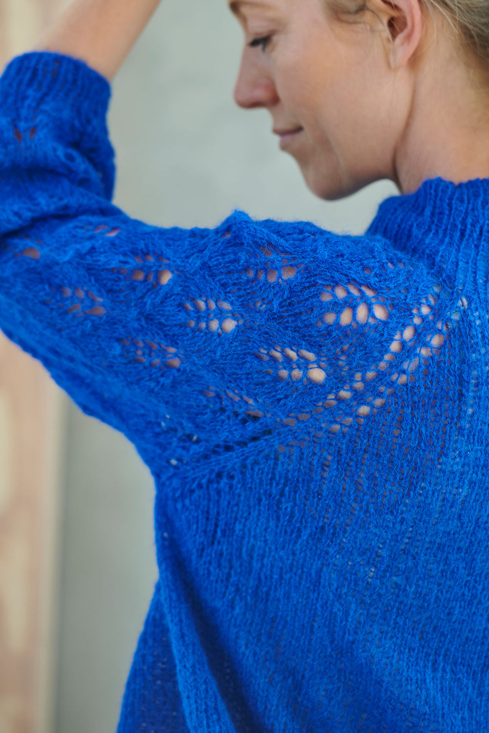 Die Rønbjerg Bluse ist eine wunderbar leichte und luftige Bluse mit gemusterten 3/4-Ärmeln und einem schönen Kragen. Die Bluse wird von oben nach unten gestrickt, sodass du mit dem breiten Kragen beginnst. Vorder- und Rückenteil der Bluse werden in glatt rechts gestrickt, während die Ärmel in einem eleganten Blattmuster gearbeitet werden. Der große Kragen fällt wunderschön und bildet ganz von selbst den Halsausschnitt.
