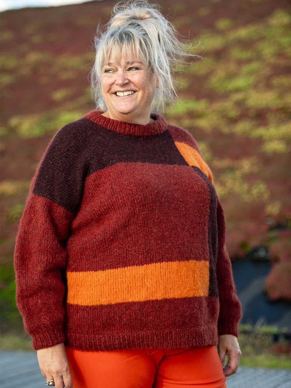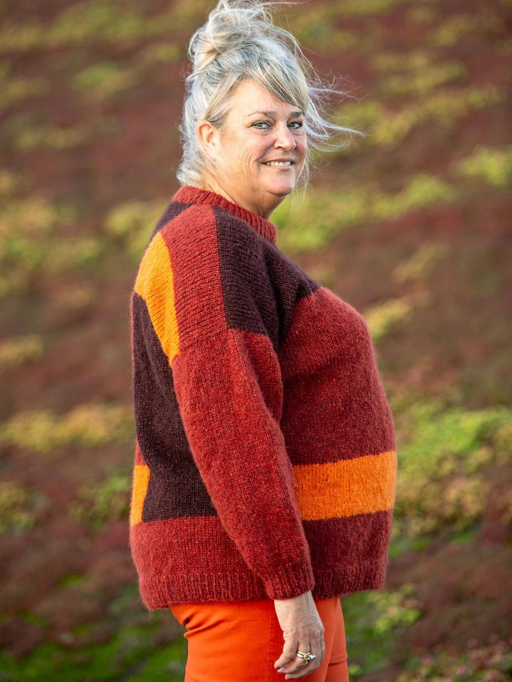 Ruby -Pullover hat ein einzigartiges, quadratisches Muster, das mit der Intarsia -Technik strickt, und das Muster geht sowohl vorne als auch nach hinten zurück.
