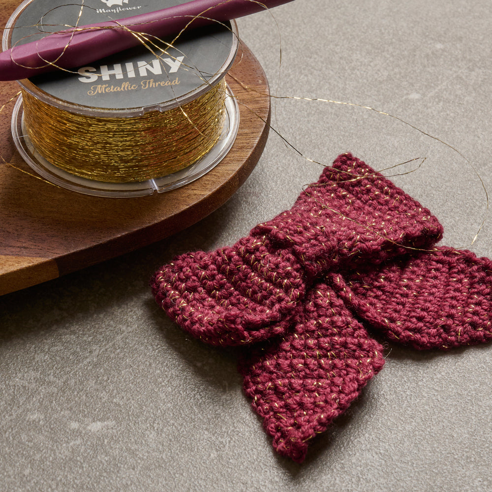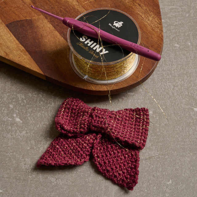 Die Schleife ist mit Mayflower London Merino Fine gehäkelt, einem weichen und köstlichen Garn aus reiner Wolle, das in vielen schönen Farben erhältlich ist. Das Garn ist einfach zu häkeln und ergibt ein schönes Ergebnis. Jedes Teil wird einzeln gehäkelt und am Ende zusammengenäht.
