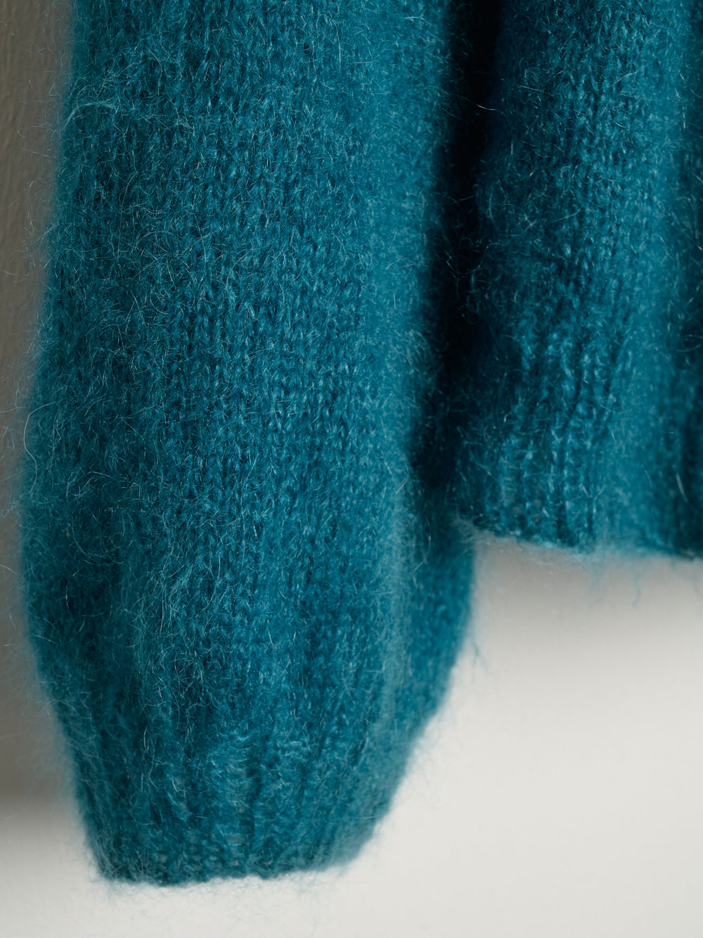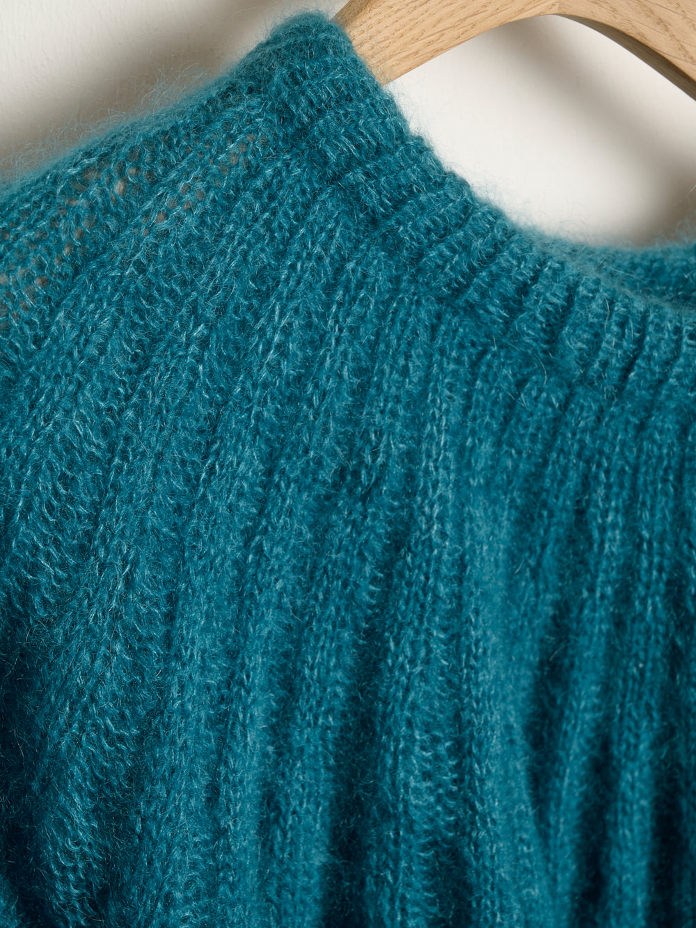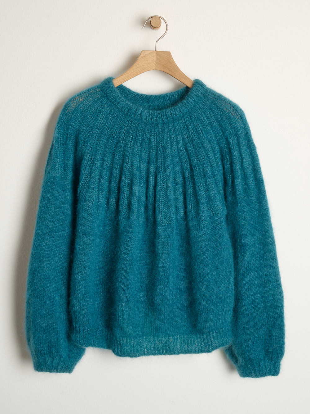 Der Sunday Sweater – Mohair Edition von PetiteKnit wird von oben nach unten gestrickt und hat ein schönes Strukturmuster im Passebereich.