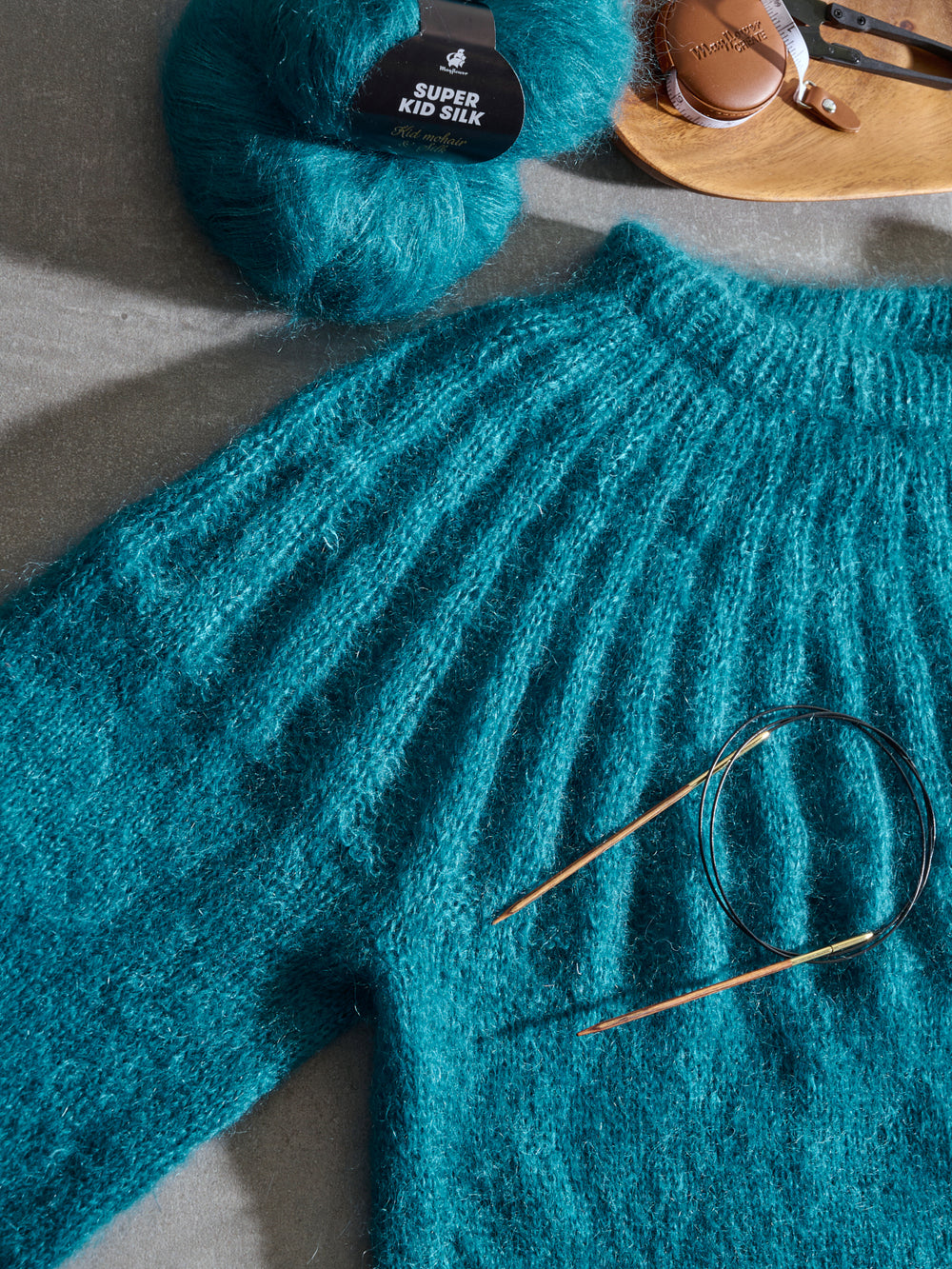 Der Sweater wird während des gesamten Strickens mit zwei Fäden Mayflower Super Kid Silk gestrickt, was ein besonders schönes Ergebnis liefert. Als Alternative zum Mohairgarn Super Kid Silk eignen sich auch die Alpakamischung Mayflower Elba oder Mayflower Premium Cassandra, die unter anderem aus Seide und Alpaka bestehen.