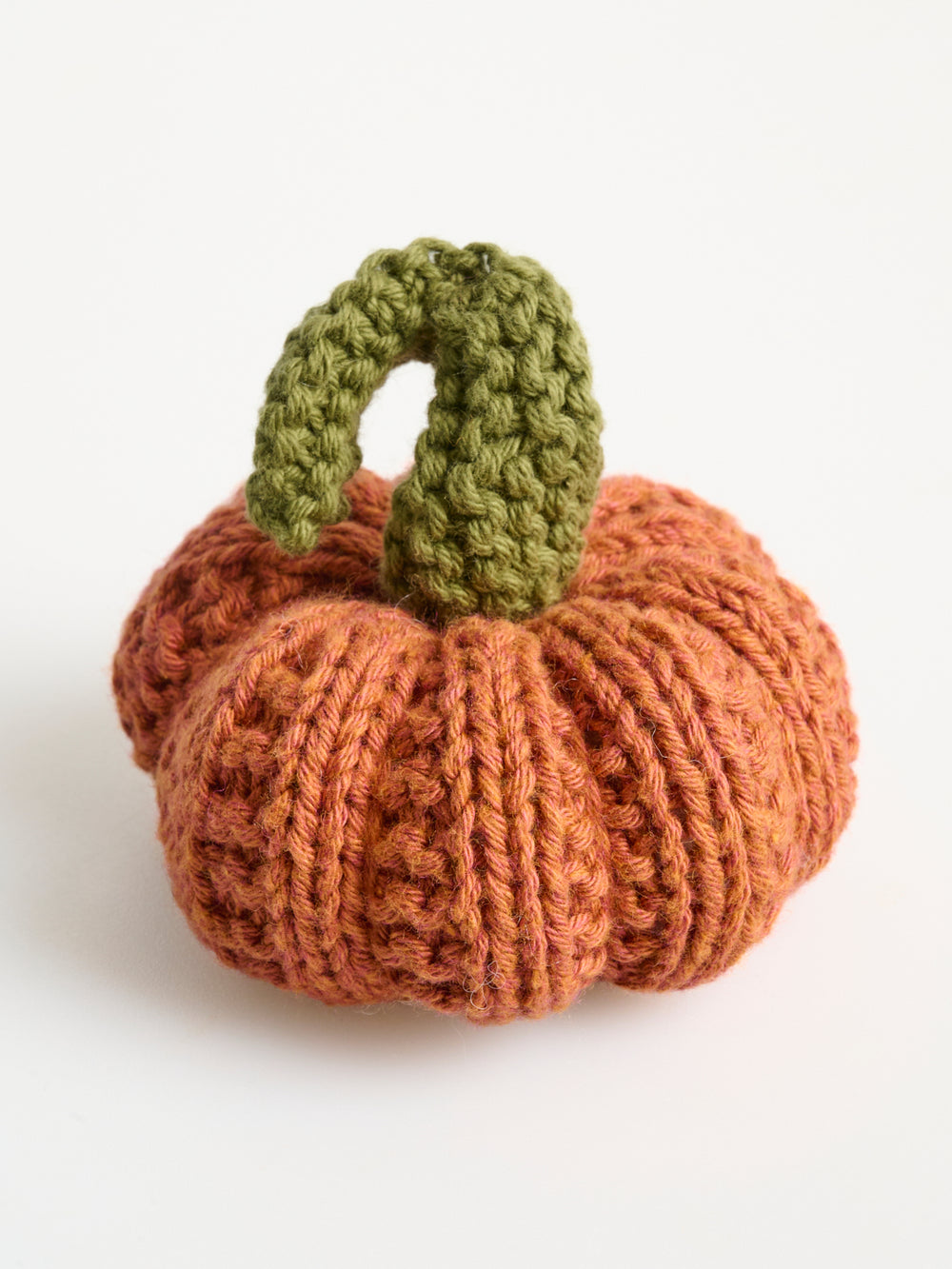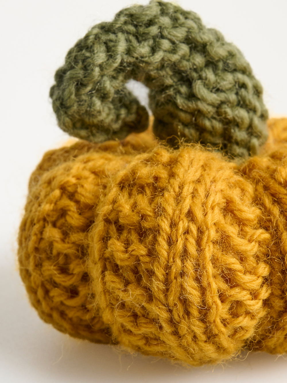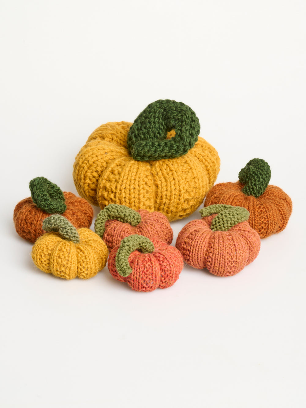 Feine, gestrickte Kürbisse, die sich wunderbar zur Dekoration in der Herbstsaison und zu Halloween eignen. Jeder Kürbis wird von unten nach oben gestrickt und anschließend mit einem Stiel zusammengesetzt.