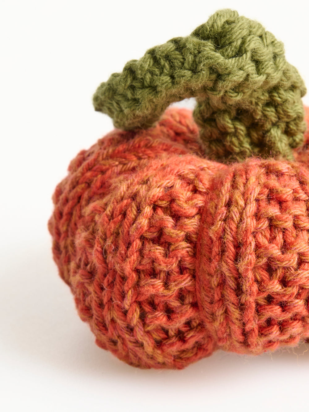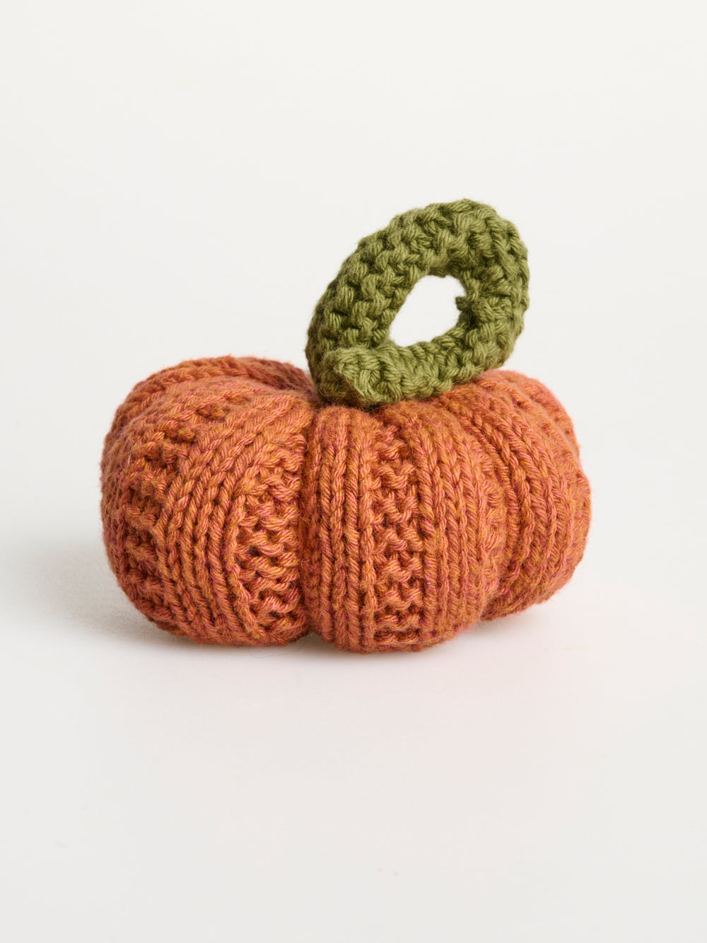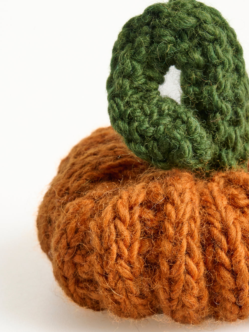 Feine, gestrickte Kürbisse, die sich wunderbar zur Dekoration in der Herbstsaison und zu Halloween eignen. Jeder Kürbis wird von unten nach oben gestrickt und anschließend mit einem Stiel zusammengesetzt.