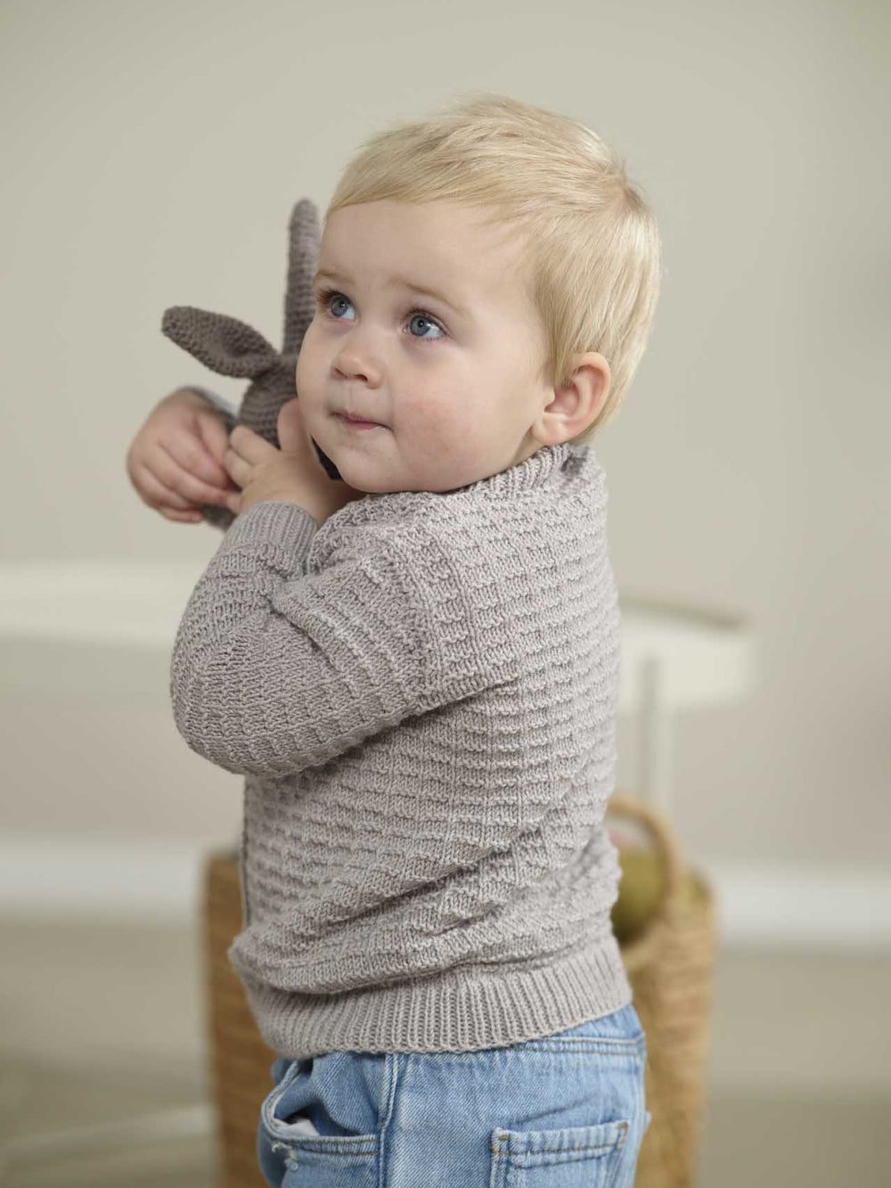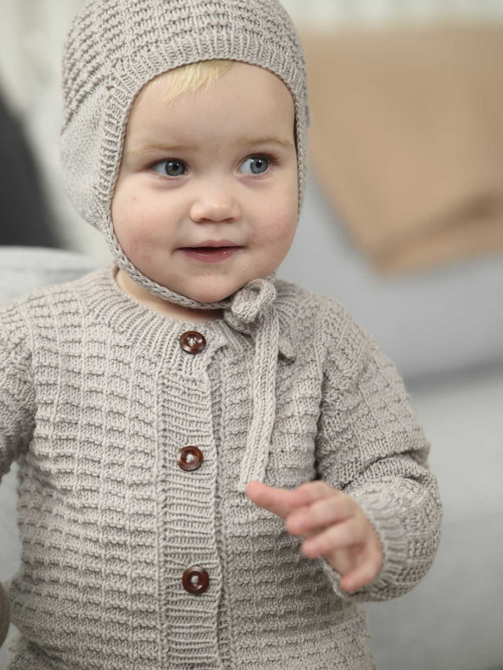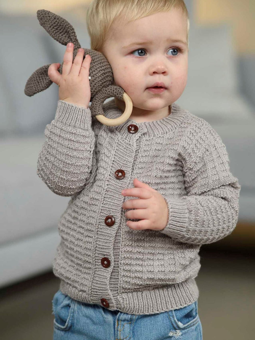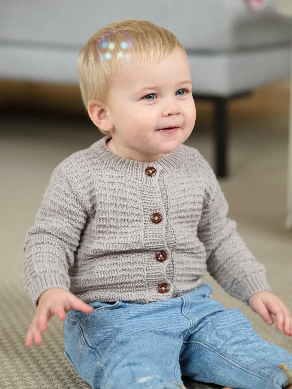 Süße Strickjacke mit einem feinen, karierten Strukturmuster, die für Kinder im Alter von 3 bis 24 Monaten gestrickt werden kann.