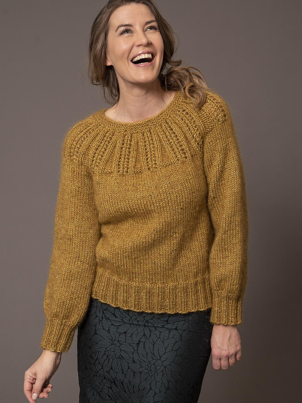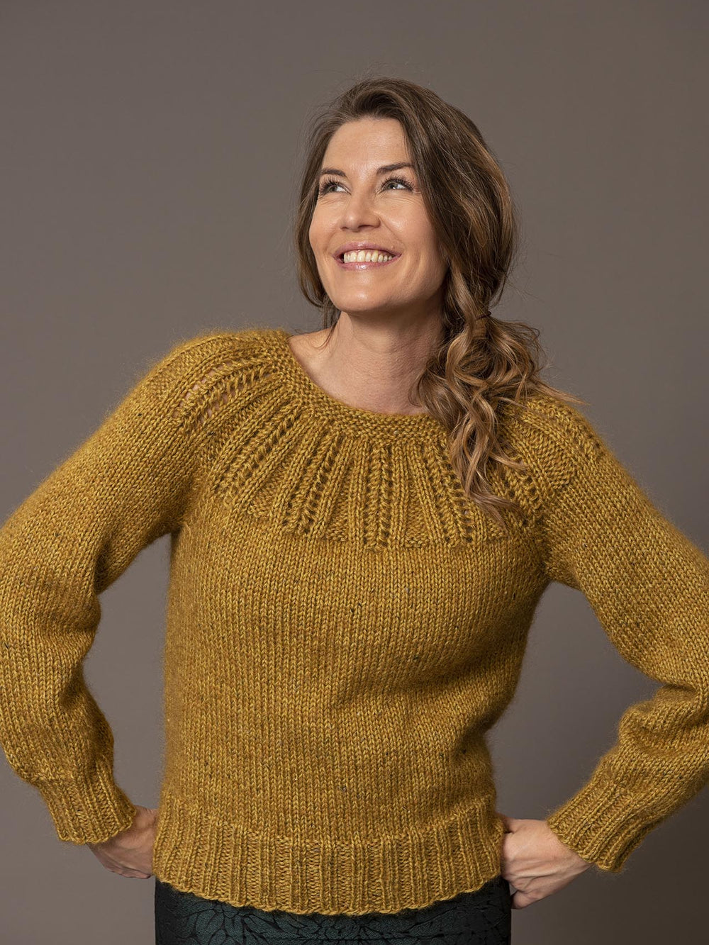 Der Viola-Pullover ist ein ideales Projekt, wenn du einen nahtfreien Pullover stricken möchtest, der von unten nach oben gearbeitet wird. Das einfache Lochmuster auf der Passe ist das anspruchsvollste Element, aber du musst kein Strickprofi sein, um diesen Pullover zu stricken.