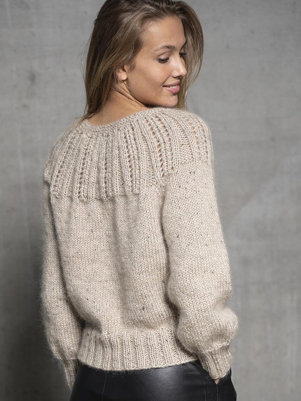 Der Viola-Pullover ist eine schöne Kombination aus herrlichem Tragekomfort und attraktivem Strickdesign. Ein schlichter Pullover mit breiten Bündchen in Doppelrippen und einem besonders schönen Passe-Detail. Der Pullover wird von unten nach oben glatt gestrickt. Die Ärmel werden separat gestrickt und anschließend direkt an den Pullover angestrickt. Dadurch ist er komplett nahtfrei und besonders einfach zu handhaben. Der schlichte Pullover hat eine bemerkenswerte Passe mit einem hübschen Lochmuster, das perfekt zum luftigen Garn passt, da das Lochmuster eine schöne und ausgeprägte Struktur erzeugt.
