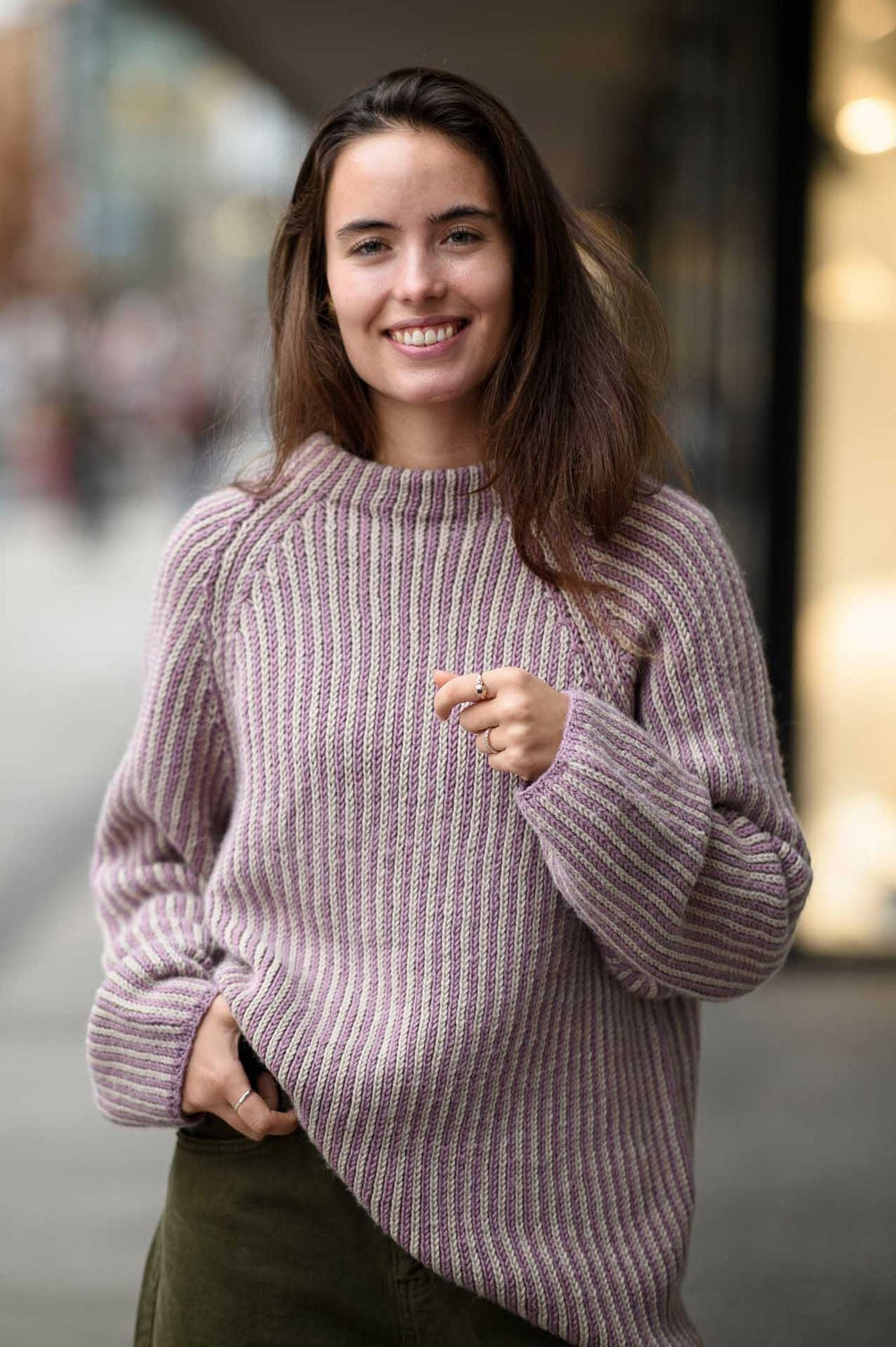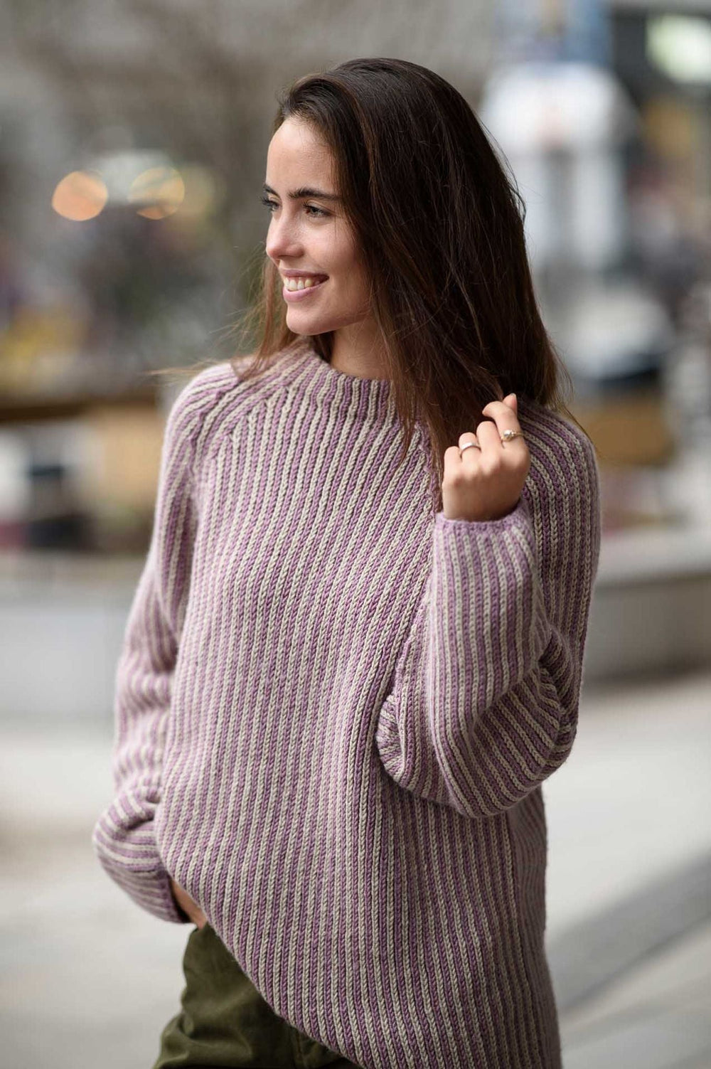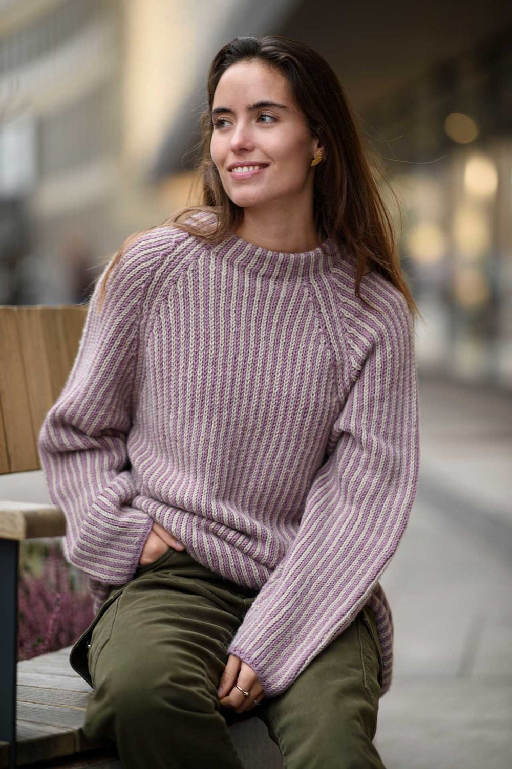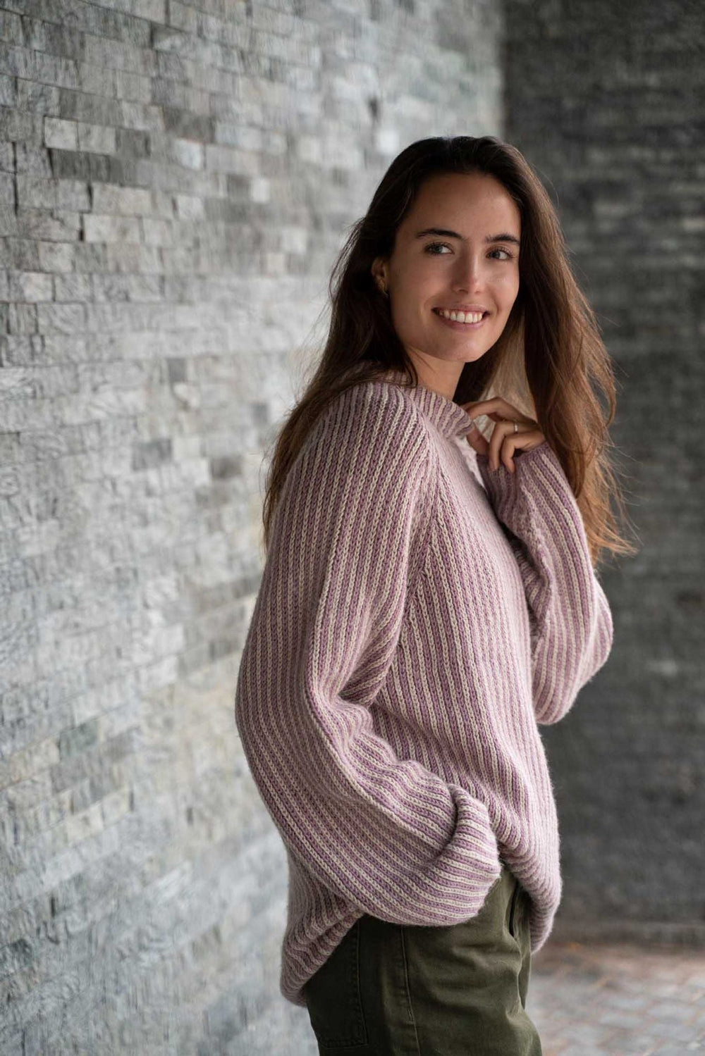 Der Vivian Pullover ist in zweifarbigem Patentstrick gearbeitet, einer Variante des klassischen Patentmusters. Glattes Patent ist eine unglaublich schöne und markante Stricktechnik, die leider oft übersehen wird. Deshalb haben wir den schönen Vivian Pullover entworfen, bei dem diese Stricktechnik voll zur Geltung kommt.