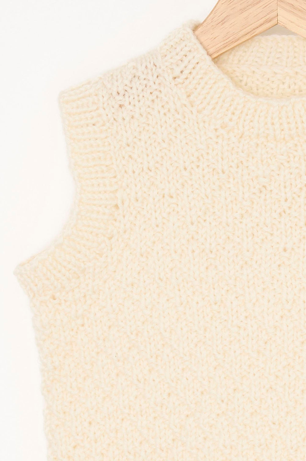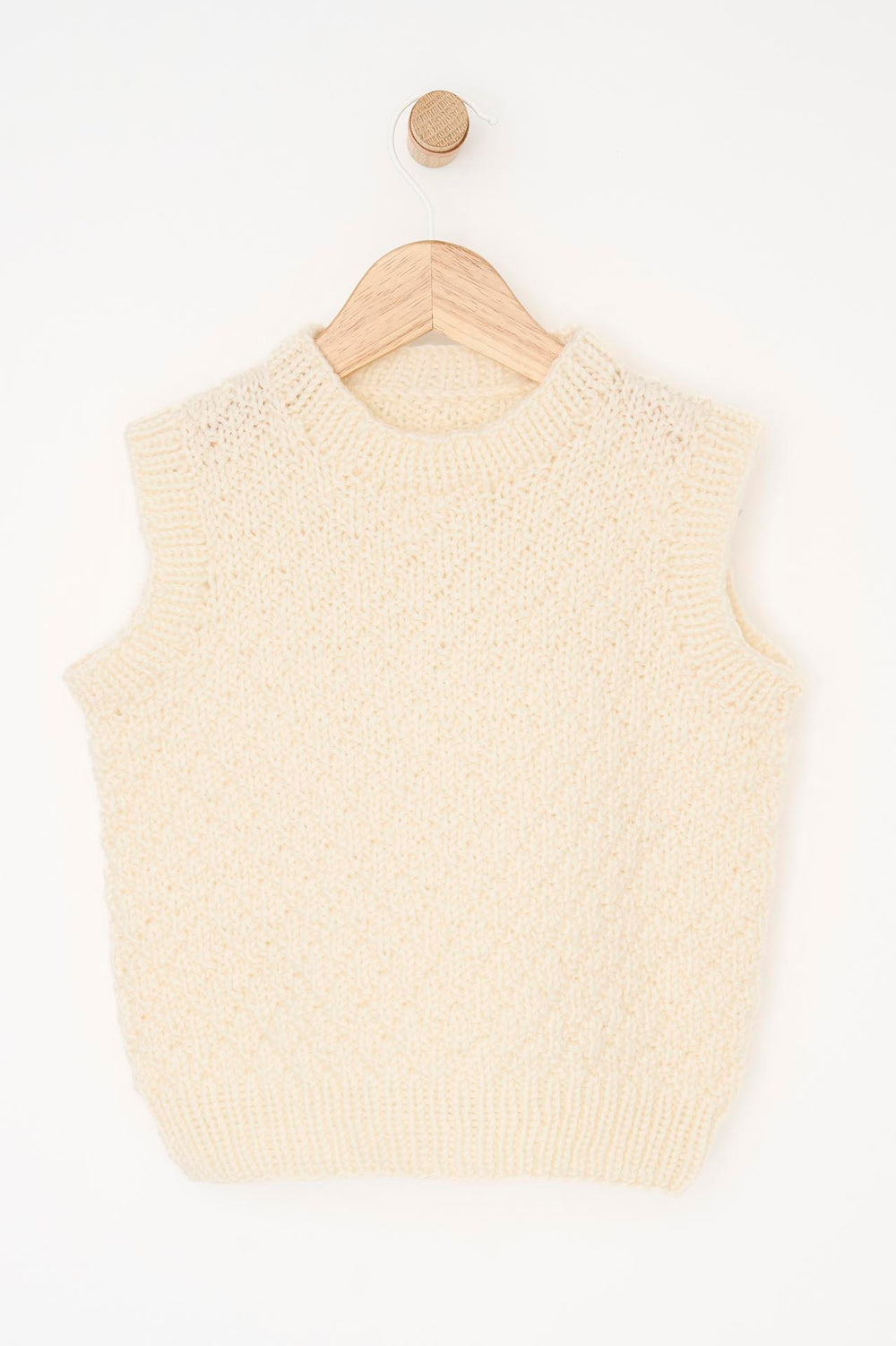 Diese Anleitung ist aus Mayflower Easy Care Big gestrickt, einer relativ starken Garnqualität aus reiner Wolle. Die Wolle sorgt dafür, dass die Weste eine gute Atmungsaktivität hat. Darüber hinaus ist die Wolle superwash-behandelt, sodass die Weste in der Maschine gewaschen und im Trockner getrocknet werden kann. Es gibt also keinen Grund zur Sorge, falls die Weste beim Spielen schmutzig wird.