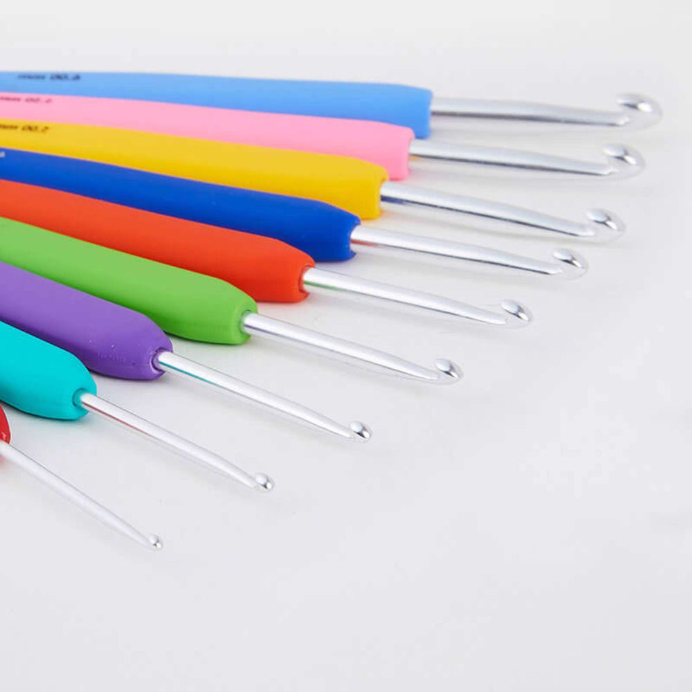Die Häkelhaken bestehen aus leichtem Aluminium mit Gummigriffe, wodurch die Häkeln wirklich gut zu halten sind. In der Mitte des Schafts befindet sich ein flacher Bereich, der den Daumen sicher in den Griff gibt, und Sie können daher lange Zeit nach dem anderen leicht häkeln, ohne in der Hand müde zu werden.