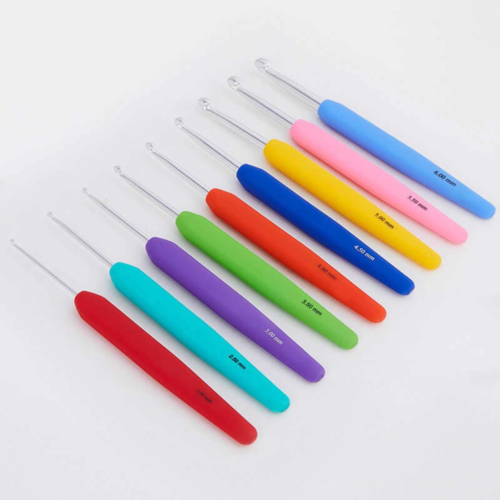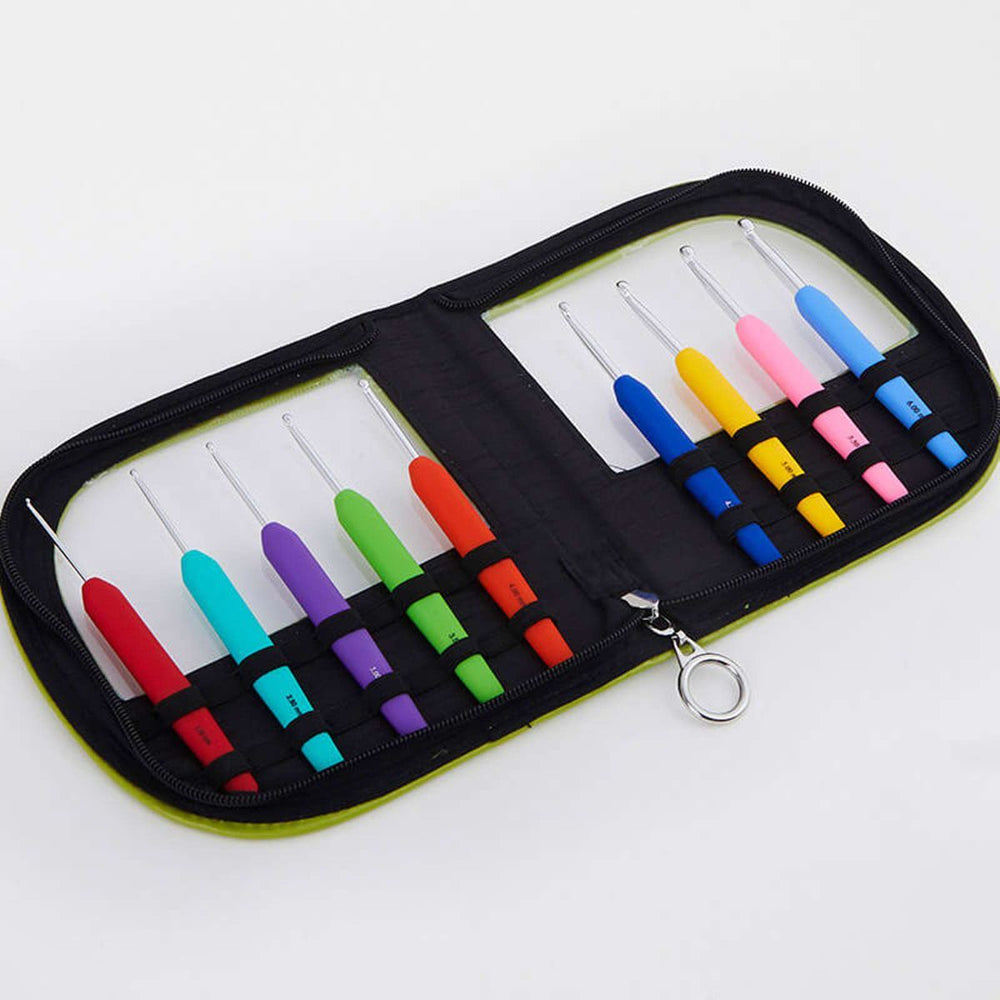 Köstliche Häkelsauce mit 9 verschiedenen Größen, die in ihrer eigenen Farbe erhältlich sind. Sie können daher leicht den Unterschied zwischen den Größen erkennen und schnell den richtigen in Bezug auf das individuelle Rezept finden. Das Kit ist ein gutes Werkzeug für alle, die häkeln möchten und die Häkelnadeln mit Gummigriffe bevorzugen möchten.